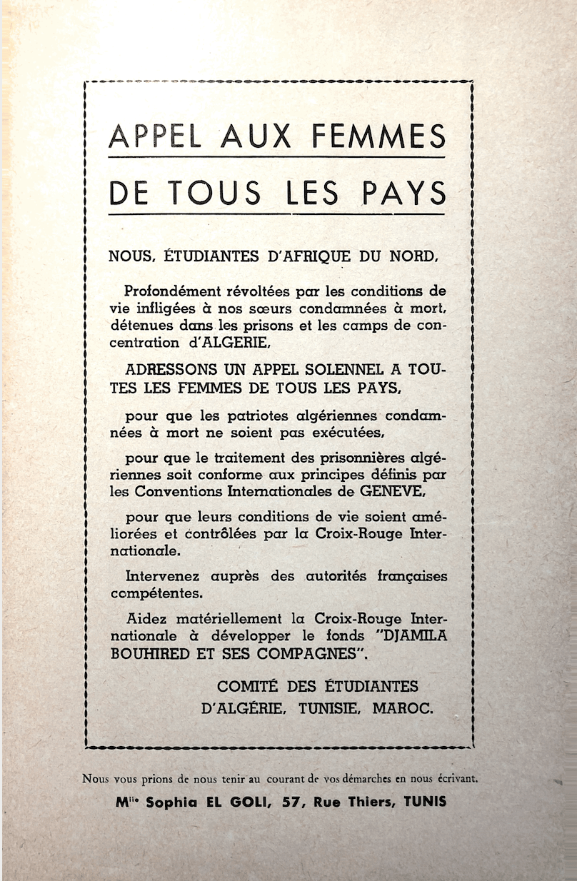 Significantly, the two Algerian War-era documents mentioned in the beginning of this essay position Mesli, Bazi, and Belmihoub at the intersection of multiple solidarities. The SPF document, through these Algerian women’s letters, shows how humanitarian action and infrastructure could help form “vertical” alliances between French and Algerian anticolonial adherents, even during the middle of a violent decolonial war. Conversely, the pamphlet published by the Comité des étudiantes d’Algérie, Tunisie, Maroc evidences human rights law as the basis of a “horizontal” alliance of Third World actors who not only shared a North African geography, but were also students and women. Indeed, the end of the pamphlet included a “call to women of all countries” to act on behalf of Algeria and donate to the International Committee of the Red Cross, specifically to help “Djamila Bouhired and her companions” (back page). This document’s focus on a particular type of women’s solidarity around human rights, humanitarianism, and decolonization is significant. It shows that the relationship between women and humanitarianism is not just one of gendered care-work, and that women had a place in human rights discourse before the United Nations’ “International Year of Women” in 1975 and “Decade for Women” from 1976 to 1985. Rather, the intersection of decolonization, human rights, and humanitarianism reveals women’s activism in the 1950s and early 1960s to be a potential vector of decolonial and humanitarian solidarity across national and regional borders. As such, attention to women at the intersection of post-WWII decolonization, human rights, and humanitarianism may allow for a gendered reading of human rights during decolonization that can help shape our understandings of the global feminist movements that emerged in the later 1960s and 1970s.